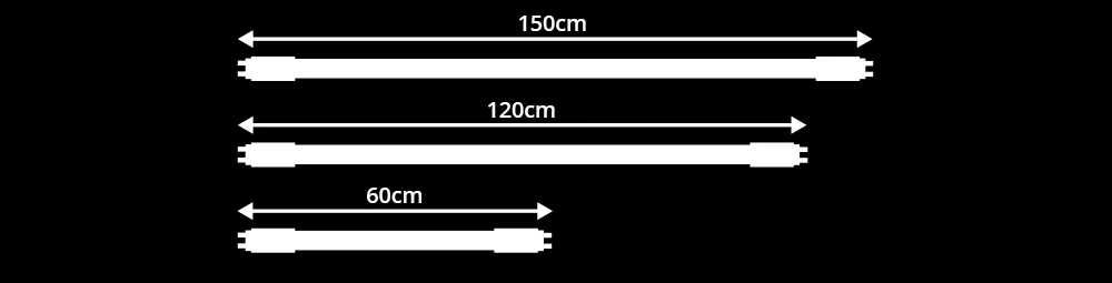 Die meisten T8 LED-Röhren kommen in den Längen 60 cm, 90 cm, 120 cm sowie 150 cm vor. T5 LED-Röhren hingegen sind in der Regel 55 cm, 115 cm und 145 cm lang. Sie möchten zu LED-Röhren wechseln? Dann überprüfen Sie unbedingt die Länge von Ihren derzeitigen Leuchtstoffröhren. Sie möchten mehr über LED-Röhren erfahren? Dann schauen Sie in unserem Blog vorbei! |